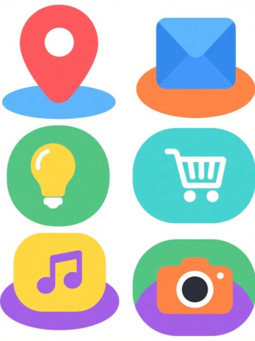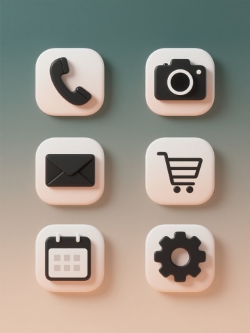软3D风格系列素材集合,纯色背景,6个完全不同元素内容规整排布,保持元素类目。第一个元素为绿色背景上的立体购物袋图标,圆润造型,高光柔和,阴影细腻;第二个元素为蓝色背景上的立体咖啡杯图标,杯身光滑,带有弧形把手,底部有轻微投影;第三个元素为黄色背景上的立体书本图标,书页有层次感,书脊清晰,整体呈倾斜放置;第四个元素为红色背景上的立体相机图标,镜头突出,机身有圆润边角,细节丰富;第五个元素为紫色背景上的立体音乐符图标,音符线条流畅,具有立体感,悬浮于背景之上;第六个元素为橙色背景上的立体信封图标,信封开口处有折叠细节,整体造型简约大方。所有元素均采用统一的软3D风格,色彩鲜明,排布规整,视觉效果协调统一。