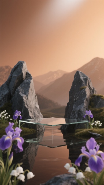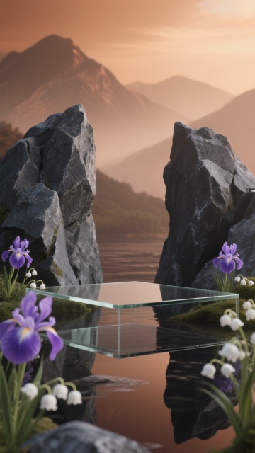 极简主义风格的未来感展示台,悬浮于静谧的深林湖泊中央,湖面倒映着周围高耸的杉树和朦胧的晨雾,背景是梦幻的粉紫色渐变天空,点缀着几颗明亮的晨星,湖边长满了白色的铃兰和蕨类植物,柔和的侧逆光勾勒出展示台的轮廓,整体氛围宁静而神秘,具有超现实的梦幻美感。