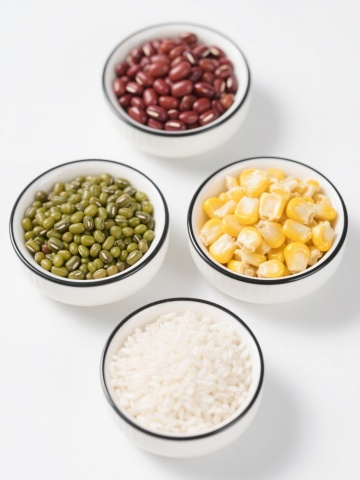 纯色背景,极简风格,六个不同元素的规整排布集合,每个元素独立占据一个区域,整体色彩变换统一协调,每个元素都具有高清晰度的摄影质感,光线柔和自然,物体边缘清晰,阴影细腻。第一个区域:装满金黄色玉米粒的粗麻布麻袋,旁边放着一个装满玉米粒的木勺,散落几颗玉米粒,旁边有一个完整的玉米棒。第二个区域:装满深红色红豆的粗麻布麻袋,旁边放着一个装满红豆的木勺,散落几颗红豆,旁边有一枝带叶的红豆枝。第三个区域:装满深绿色绿豆的粗麻布麻袋,旁边放着一个装满绿豆的木勺,散落几颗绿豆,旁边有几片绿豆叶。第四个区域:装满浅棕色燕麦片的粗麻布麻袋,旁边放着一个装满燕麦片的木勺,散落几片燕麦片,旁边有一株燕麦穗。第五个区域:装满白色糯米的粗麻布麻袋,旁边放着一个装满糯米的木勺,散落几颗糯米,旁边有一片粽子叶。第六个区域:装满浅粉色小米的粗麻布麻袋,旁边放着一个装满小米的木勺,散落几颗小米,旁边有一枝带穗的小米杆。
