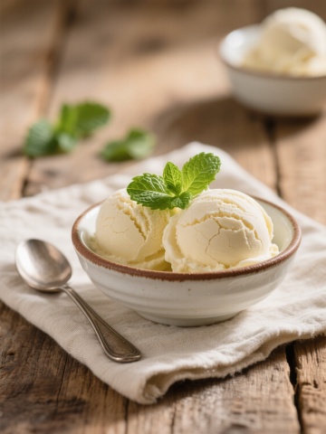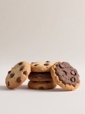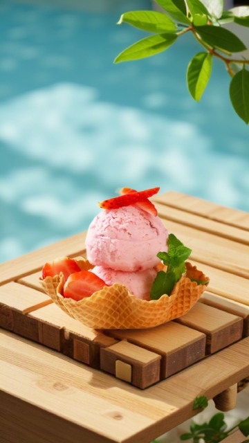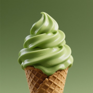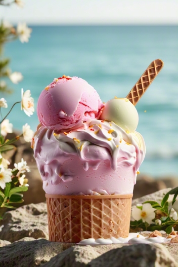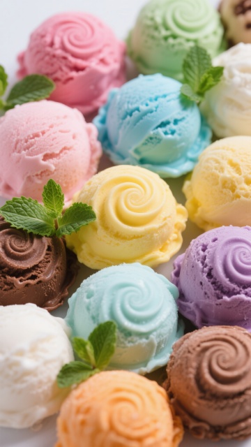 色彩鲜艳的写实风格冰淇淋球组合,透明雕花玻璃高脚杯盛放,三个不同口味的冰淇淋球堆叠:深棕色巧克力口味带细腻波纹,白色香草口味点缀黑色巧克力碎,浅棕色香草口味顶部装饰黑色几何图案巧克力片,右侧有螺旋状奶油,杯壁内侧底部有彩色水果丁(红色樱桃、黄色芒果块),两根棕色酥脆蛋筒斜插在冰淇淋球后方,整体光影明亮柔和,高光突出冰淇淋的丝滑质感和玻璃的透明光泽,色彩饱和度高且对比鲜明,构图饱满居中,背景为纯白色。