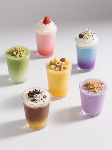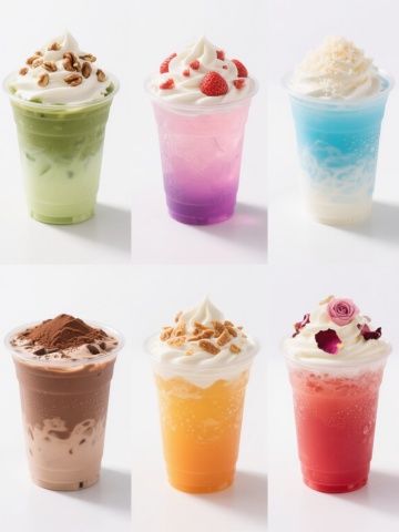 一组6个完全不同造型的同系列饮品素材集合,每个饮品均为透明塑料杯盛装,保持高清晰度、明亮光线、白色背景的写实摄影风格,整体规整排布。第一个饮品为芒果椰奶冰沙,顶部堆满金黄芒果块并撒有椰蓉,杯身呈现渐变橙黄色,内含芒果果肉和椰奶分层;第二个为蓝莓芝士奶盖茶,顶部是厚实的奶盖并撒有蓝莓碎,杯身是深蓝色渐变,底部有蓝莓果肉沉淀;第三个为抹茶红豆冰沙,顶部放置抹茶冰淇淋球和红豆粒,杯身呈清新绿色,内含红豆颗粒和奶油纹路;第四个为葡萄乳酸菌饮品,顶部有整颗青提装饰,杯身是淡紫色渐变,液体中漂浮着葡萄果肉和气泡;第五个为凤梨椰香冰沙,顶部是烤凤梨片和薄荷叶,杯身呈淡黄色,内含凤梨果肉和椰奶分层;第六个为巧克力可可冰沙,顶部堆满巧克力碎和可可粉,杯身是深棕色渐变,液体中可见巧克力酱纹路和冰块。所有饮品均有明显的冰爽质感,杯壁有水珠效果,整体色彩鲜艳且每个造型各具特色,统一在白色背景上整齐排列成系列素材。