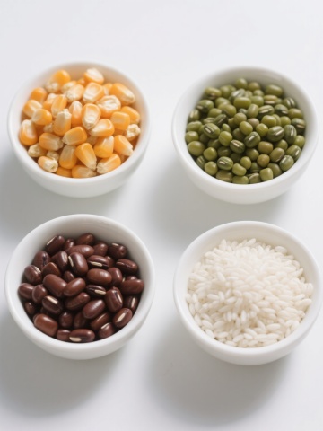 纯色背景,极简风格,六个不同元素的规整排布集合,每个元素独立占据一个区域,整体色彩变换统一协调,每个元素都具有高清晰度的摄影质感,光线柔和自然,物体边缘清晰,阴影细腻。第一个区域:装满金黄色玉米粒的粗麻布麻袋,旁边放着一个装满玉米粒的木勺,散落几颗玉米粒,旁边有一个完整的玉米棒。第二个区域:装满深红色红豆的粗麻布麻袋,旁边放着一个装满红豆的木勺,散落几颗红豆,旁边有一枝带叶的红豆枝。第三个区域:装满深绿色绿豆的粗麻布麻袋,旁边放着一个装满绿豆的木勺,散落几颗绿豆,旁边有几片绿豆叶。第四个区域:装满浅棕色燕麦片的粗麻布麻袋,旁边放着一个装满燕麦片的木勺,散落几片燕麦片,旁边有一株燕麦穗。第五个区域:装满白色糯米的粗麻布麻袋,旁边放着一个装满糯米的木勺,散落几颗糯米,旁边有一片粽子叶。第六个区域:装满浅粉色小米的粗麻布麻袋,旁边放着一个装满小米的木勺,散落几颗小米,旁边有一枝带穗的小米杆。