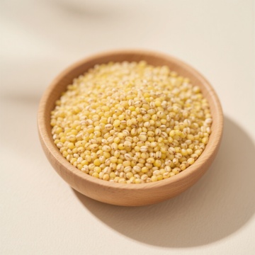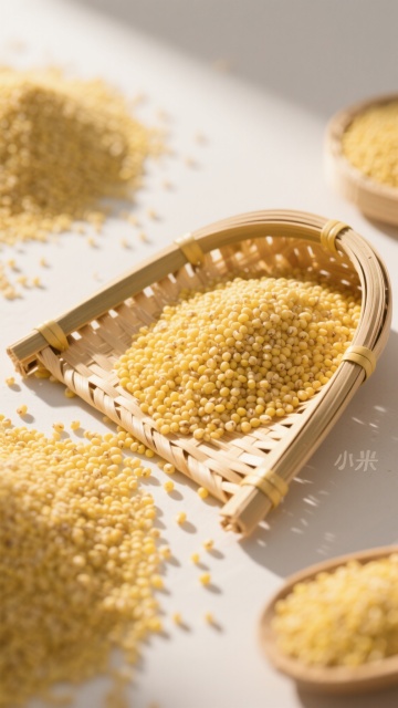 写实风格摄影,特写镜头,小米(黄色小米粒)盛满黑色粗陶碗,木勺从碗中舀起部分小米,米粒饱满圆润,表面有细腻光泽,散落的小米粒铺陈在深色木质桌面上,温暖柔和的侧逆光,高光处米粒边缘泛金黄,阴影深邃自然,色调以暖黄色为主,搭配深棕木色背景,营造质朴、原生态、健康的氛围,光线层次分明,质感细腻,构图聚焦碗中小米,细节清晰,颗粒感强。
