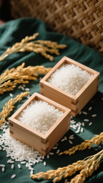 高清写实风格的大米产品展示图,主体为一个装满饱满长粒白米的浅棕色木质碗,米粒晶莹剔透,表面光滑带有自然光泽,碗的木纹清晰可见且质感温暖。碗的左侧放置两束金黄饱满的麦穗,麦芒细长分明,呈现出自然的弯曲形态。碗的右下方有一个小一号的木质勺子,勺子里盛有部分大米,勺口处散落出少量米粒在白色背景上。整体色彩以白色(大米)、浅棕色(木碗、木勺)和金黄色(麦穗)为主,色彩和谐自然。光线从左上方柔和照射,在碗和勺子上形成轻微的高光和自然的阴影,增强立体感和真实质感。构图采用中心对称布局,主体突出,背景为纯白色,简洁干净,无任何文字、LOGO或多余元素,整体氛围清新、自然、纯净,专注于展示大米的优质品质和天然属性。