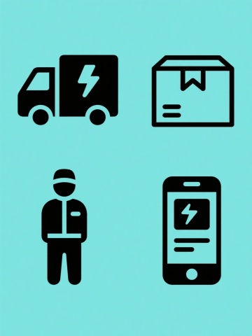 扁平化设计风格的快递员图标,黑色粗线条勾勒轮廓,白色填充背景,人物戴着有帽檐的帽子,身穿有口袋的制服,双手自然下垂,整体造型简洁、几何化,线条流畅无装饰,符合现代图标设计的简约美学,适合用于物流、配送相关的界面或标识系统。