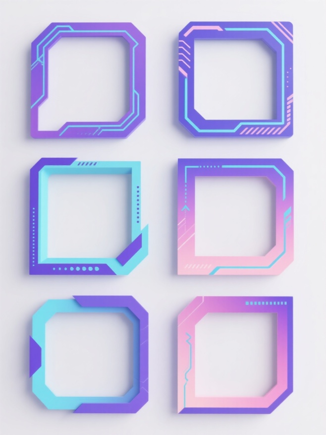 白色背景上整齐排列的六个不同配色的科技感边框,每个边框都有独特的样式,包含几何线条、箭头、点状装饰和渐变色彩,整体呈现出未来感和科技美学,线条流畅,设计简洁,色彩以蓝紫色调为主,搭配青色和粉色渐变,每个边框内部留白充足,适合作为信息展示框使用,具有清晰的视觉层次和现代设计感。