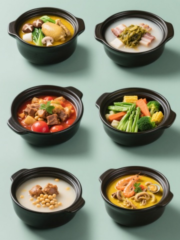 高质感美食摄影,暖色调灯光营造温馨氛围,深色木质餐桌上铺着绿色芭蕉叶,中央摆放黑色陶锅盛装的红烧大块肉,表面点缀白色菊花与绿色香菜,周围环绕多道菜肴:左侧两碗白米饭撒有葱花,前方白色瓷盘盛有菠萝虾仁沙拉,右侧银色金属碗装彩色蔬菜丁,背景有棕色陶罐与插着橙色花朵的白色瓷瓶,整体构图饱满,食物细节清晰,光影层次丰富,营造出丰盛诱人的餐饮场景。