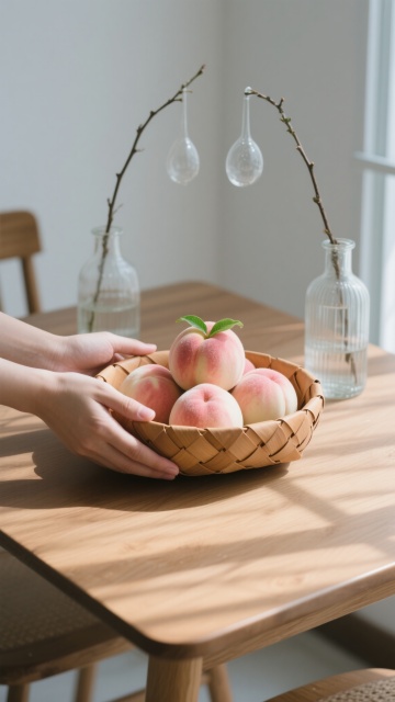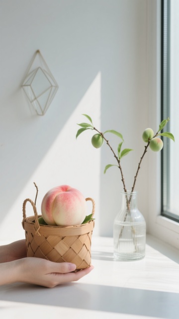 一张温馨明亮的桌面场景照片,柔和的自然光从木质格栅窗洒入,照亮铺着浅米色粗麻布桌布的桌面。桌面上,左侧放着一本翻开的书,书上点缀着两颗鲜红饱满的草莓和一个小巧的浅蓝色陶瓷花瓶,瓶中插着几枝开着白色小花的细枝。右侧是一杯装满纯白色牛奶的透明玻璃杯,旁边放着一个色泽红润的桃子。整体色调清新自然,光影柔和,营造出宁静舒适的居家氛围,具有生活美学的构图和细腻的质感表现。