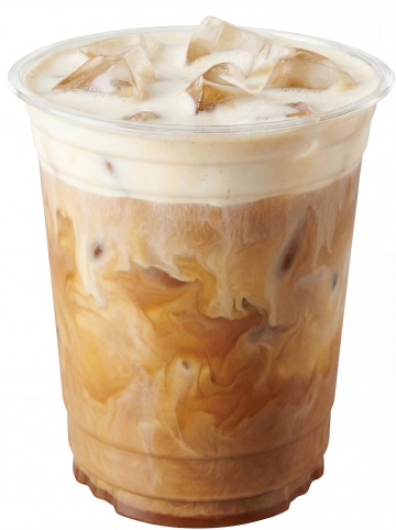 一杯透明塑料杯中装满了渐变分层的冰拿铁咖啡,上层是浓郁的焦糖色,中间过渡为柔和的橙黄色,下层是纯净的乳白色,杯口覆盖着大量透明的冰块,冰块表面折射出光泽,整体呈现出清新透亮的质感,光影效果自然,色彩过渡细腻,背景为纯白色,突出饮品主体。