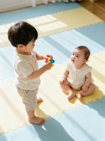 明亮柔和的室内自然光下,一位亚洲婴儿坐在浅色木地板上的白色柔软地垫上,穿着米白色针织连体衣,双手开心地向上举起,脸上洋溢着灿烂的笑容,背景中挂着蓝灰色系的三角旗装饰,整体画面温馨治愈,色调温暖柔和,光线均匀自然,婴儿的皮肤质感细腻,服饰纹理清晰,构图居中,展现出婴儿活泼可爱的瞬间。