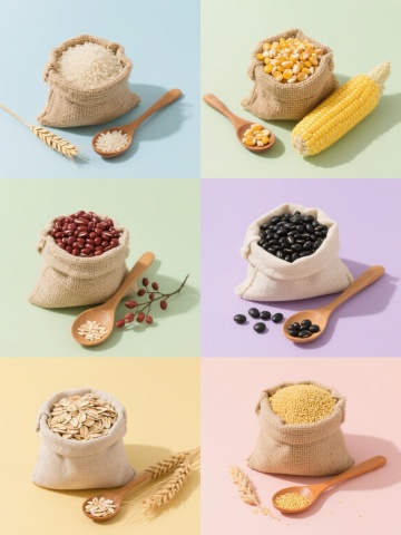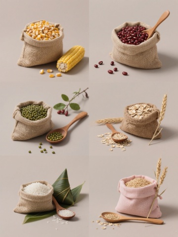 纯色背景,极简风格,六个不同元素的规整排布集合,每个元素独立占据一个区域,整体色彩变换统一协调,每个元素都具有高清晰度的摄影质感,光线柔和自然,物体边缘清晰,阴影细腻。第一个区域:装满金黄色玉米粒的粗麻布麻袋,旁边放着一个装满玉米粒的木勺,散落几颗玉米粒,旁边有一个完整的玉米棒。第二个区域:装满深红色红豆的粗麻布麻袋,旁边放着一个装满红豆的木勺,散落几颗红豆,旁边有一枝带叶的红豆枝。第三个区域:装满深绿色绿豆的粗麻布麻袋,旁边放着一个装满绿豆的木勺,散落几颗绿豆,旁边有几片绿豆叶。第四个区域:装满浅棕色燕麦片的粗麻布麻袋,旁边放着一个装满燕麦片的木勺,散落几片燕麦片,旁边有一株燕麦穗。第五个区域:装满白色糯米的粗麻布麻袋,旁边放着一个装满糯米的木勺,散落几颗糯米,旁边有一片粽子叶。第六个区域:装满浅粉色小米的粗麻布麻袋,旁边放着一个装满小米的木勺,散落几颗小米,旁边有一枝带穗的小米杆。