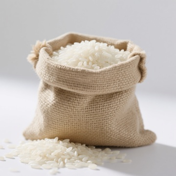 高清写实风格的大米产品展示图,主体为一个装满饱满长粒白米的浅棕色木质碗,米粒晶莹剔透,表面光滑带有自然光泽,碗的木纹清晰可见且质感温暖。碗的左侧放置两束金黄饱满的麦穗,麦芒细长分明,呈现出自然的弯曲形态。碗的右下方有一个小一号的木质勺子,勺子里盛有部分大米,勺口处散落出少量米粒在白色背景上。整体色彩以白色(大米)、浅棕色(木碗、木勺)和金黄色(麦穗)为主,色彩和谐自然。光线从左上方柔和照射,在碗和勺子上形成轻微的高光和自然的阴影,增强立体感和真实质感。构图采用中心对称布局,主体突出,背景为纯白色,简洁干净,无任何文字、LOGO或多余元素,整体氛围清新、自然、纯净,专注于展示大米的优质品质和天然属性。