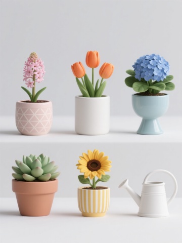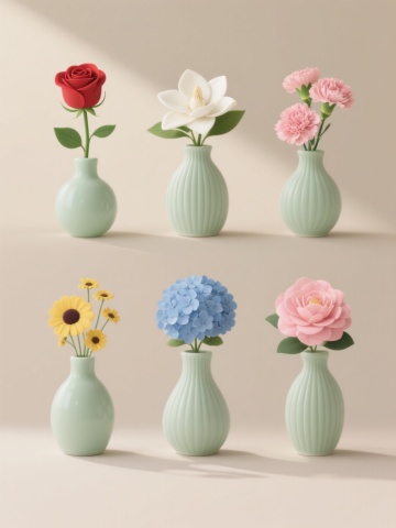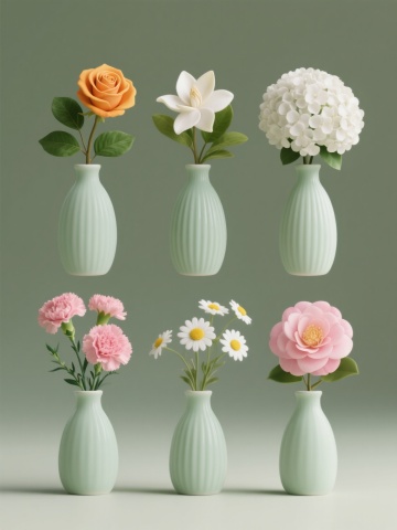 一组六个具有统一极简主义风格的花瓶插画集合,每个花瓶均为淡绿色磨砂质感陶瓷材质,瓶身带有细密竖条纹纹理,高光柔和自然,光影效果为顶部斜射光源,底部有轻微阴影,整体呈现温馨雅致的居家氛围。每个花瓶中插有不同种类的单束鲜花:第一个花瓶插着盛开的红色玫瑰花,配以绿色花茎和叶片;第二个花瓶插着清新的白色栀子花,花瓣饱满;第三个花瓶插着粉色康乃馨,花型呈扇形;第四个花瓶插着蓝色绣球花,花朵簇拥成球状;第五个花瓶插着黄色小雏菊,中心为深色;第六个花瓶插着粉色山茶花,花瓣层层叠叠。六个花瓶整齐排列成两行三列,背景为纯色浅米色,整体构图简洁平衡,色彩和谐统一,具有清晰的视觉层次和高效的信息传达,适合作为家居装饰素材使用。