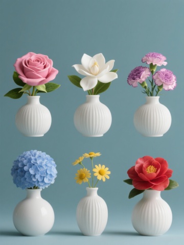 一组6个相同风格的花瓶系列素材集合,规整排布在纯色背景上,每个花瓶均为原图中同款的白色哑光陶瓷材质、带有细腻竖条纹纹理的圆润瓶身设计,保持高度一致的写实主义风格和清晰的光影细节。从左到右、从上到下(或按2x3网格均匀排列)依次为:1. 插有盛开的粉红色玫瑰花的花瓶,花朵层次分明,搭配绿色花萼与叶片;2. 插有洁白芬芳的栀子花的花瓶,花瓣饱满,绿叶衬托;3. 插有粉紫色康乃馨的花瓶,花瓣边缘呈波浪状,姿态优雅;4. 插有蓝色绣球花的花瓶,花球圆润饱满,色彩清新;5. 插有黄色小雏菊的花瓶,花瓣呈放射状,中心为黄色花芯,充满活力;6. 插有红色山茶花的花瓶,花瓣厚实有光泽,形态端庄。整体画面色彩协调统一,每个花瓶及花卉的光影效果、质感表现与原图保持一致,背景为干净的纯色,突出主体花瓶与花卉的细节之美。