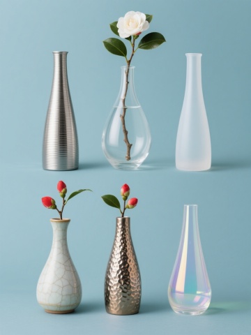 六个相同造型的细长瓶身花瓶,每个花瓶内插有一枝带绿叶、一朵盛开白色山茶花和两朵红色花苞的树枝,以2行3列规整排布在纯色背景上。六个花瓶分别呈现出六种完全不同的材质质感:1. 左侧上方:金属材质,表面光滑有冷冽光泽和细微拉丝纹理;2. 右侧上方:塑料材质,半哑光表面带有轻微磨砂质感;3. 左侧中间:玻璃材质,透明清澈,能隐约看到内部花枝轮廓,表面有折射光影;4. 右侧中间:合金材质,呈现出独特的金属混合色泽,带有细密的锤击纹理;5. 左侧下方:陶瓷材质,表面有温润细腻的釉面质感,带有传统陶瓷的微小开片纹路;6. 右侧下方:亚克力材质,半透明带有柔和的光泽,边缘有轻微的虹彩效果。整体画面色彩明快,背景为纯色,突出展示不同材质花瓶的质感差异和统一的造型美感,保持清晰的视觉层次和信息传达效率。