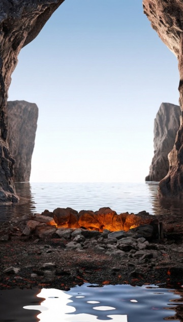 超写实3D渲染风格的岩石背景,深灰与浅棕的岩石表面带有细腻的纹理和自然的光影变化,顶部呈现渐变的暖橙色天空过渡到下方的浅灰色背景,底部有光滑的深色水面倒映岩石,不同场景下岩石以多样角度错落分布,形成自然的空间层次,整体氛围宁静而富有质感,光线柔和地从岩石间隙洒落,营造出极简而高级的视觉效果。