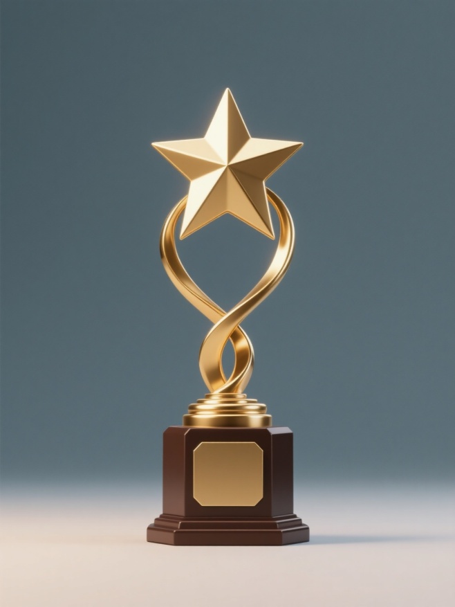 3D渲染风格,简约现代设计,金色奖杯,奖杯主体为独特样式的金色星形顶部,搭配流畅弯曲的金色支架,底座为深棕色六边形,整体造型精致,金属质感强烈,高光与阴影过渡自然,纯色背景,奖杯居中规整排布,作为系列素材中的单一元素图案。