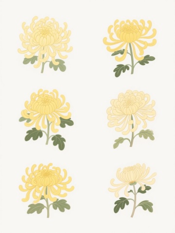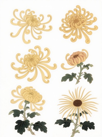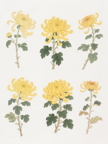 中国传统水墨风格插画,两朵盛开的橙黄色菊花,花瓣卷曲呈放射状,花蕊饱满,墨绿色花茎挺立,两侧分布多片深绿与浅绿渐变的锯齿状叶片,部分嫩叶呈黄绿色,笔触兼具水墨的晕染感与工笔的细腻线条,整体构图为垂直向上的自然生长形态,背景为纯白色,营造出清雅高洁的文人画氛围,色彩明快和谐,展现菊花的傲然姿态与勃勃生机。