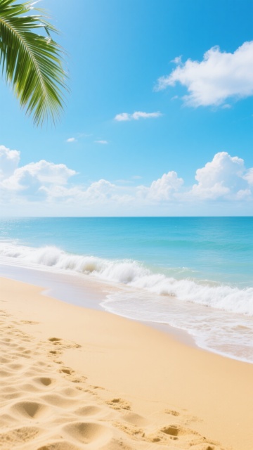 高清摄影风格的海滩风景,细腻真实的质感,画面下方是大面积金黄色的沙滩,沙子纹理清晰可见,有自然形成的波浪状起伏和细微的颗粒感。中景是浅蓝色的海水,海浪轻轻拍打沙滩,形成白色的浪花边缘,海水呈现出由浅至深的渐变蓝色。远景是广阔的海平面,与上方的天空相接。天空占据画面上半部分,是明亮的蔚蓝色,点缀着几朵形态自然、边缘柔和的白色积云,云层分布稀疏,阳光透过云层洒下,光线明亮柔和,整体画面充满清新、宁静、开阔的氛围。左上角有几片绿色的棕榈叶斜向伸出,叶片脉络清晰,色彩鲜亮,为画面增添了一抹自然的生机,整体构图采用三分法,沙滩、海水、天空层次分明,视觉引导线自然,色彩和谐统一,给人以放松、惬意的度假感。