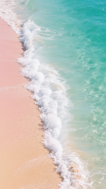 从高空俯瞰的海浪与沙滩全景,采用印象派油画风格,以厚重的笔触和丰富的色彩层次描绘。画面上方是深邃的靛蓝色海洋,逐渐过渡到明亮的青绿色波浪,阳光照射下泛着金色的光斑。海浪呈现出动态的卷曲形态,白色的浪花泡沫细腻而富有质感,与下方细腻的米白色沙滩形成鲜明对比。沙滩上留有浅浅的水痕和波纹,整体色调清新明快,营造出宁静而充满活力的海滨氛围。