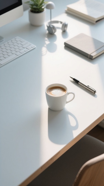 自然光从窗户斜射而入,在浅色墙壁上投下清晰的窗格阴影,营造出明亮通透、宁静舒适的居家办公氛围。一张原木色桌面的书桌,桌面光滑有自然木纹,桌腿为白色简约设计。桌上放置着不同场景和布置:左侧可能是一盆茂盛的绿色观叶植物,右侧是一台打开的银色笔记本电脑,电脑旁叠放着几本不同厚度的书籍,书籍上点缀着一盆小型多肉植物在白色花盆中;或者桌面上是一盏简约设计的台灯,旁边散落着几本翻开的笔记本和一支金属钢笔,桌角可能还有一个小巧的相框或一个复古风格的时钟;又或者是桌面上整齐排列着绘画工具,几支不同型号的画笔插在陶瓷笔筒中,旁边放着打开的颜料盒和一张铺展开的素描纸,角落点缀着一杯热气腾腾的咖啡杯。整体画面采用写实主义风格,色彩以原木色、白色、绿色为主,光影对比柔和,细节丰富,展现出现代简约而不失温馨的不同书桌场景布置。