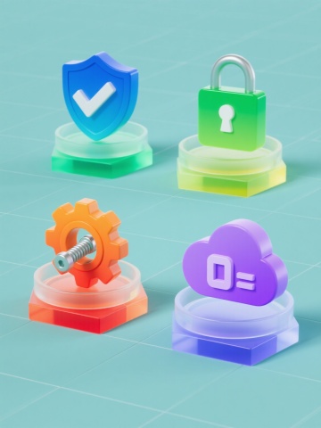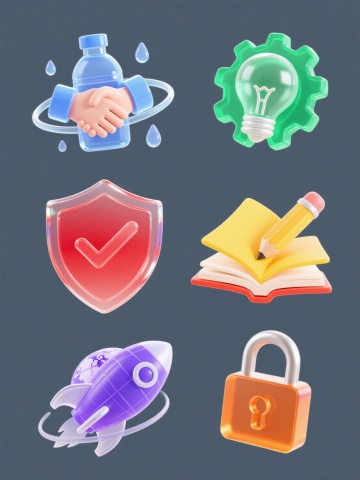一系列6个3D立体图标,每个图标都具有透明渐变的玻璃质感,边缘锐利且带有高光反射,整体风格保持一致。第一个图标是蓝色透明的握手与水瓶组合,周围环绕着水滴和圆形光环;第二个图标是绿色透明的齿轮与灯泡组合,齿轮边缘有锯齿状细节,灯泡内部有灯丝结构;第三个图标是红色透明的盾牌与对勾组合,盾牌表面有光滑的弧度,对勾线条流畅;第四个图标是黄色透明的书本与铅笔组合,书本页面有层次感,铅笔笔尖尖锐;第五个图标是紫色透明的地球与火箭组合,地球表面有经纬线纹理,火箭有流线型设计;第六个图标是橙色透明的钥匙与锁组合,钥匙齿纹清晰,锁孔呈圆形。所有图标均以纯色背景为衬托,色彩变换鲜明,元素类目保持不变,整体规整地排列在画面中,每个图标之间间距均匀,形成和谐统一的系列素材集合。