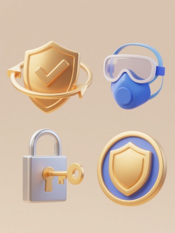 安全题材图标集合,6个不同配色与造型的安全元素规整排布,每个元素保持3D立体风格、光滑渐变质感、半透明高光及轻微阴影效果,纯色背景。包含:1.蓝色盾牌配对勾,2.红色锁形图标,3.绿色警示三角,4.黄色安全帽,5.紫色防护手套,6.橙色急救箱,统一采用圆角几何造型与悬浮底座设计,整体保持现代科技感与安全主题的视觉统一性。