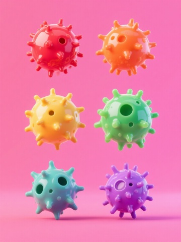 6个不同配色、不同品种、不同造型的细菌素材集合,保持3D渲染风格,每个细菌具有独特的形态特征,如球形带突起、多触角状、放射状等,表面呈现细腻的纹理和光泽,采用纯色背景,规整排布,色彩分别为红色、黄色、绿色、紫色、橙色、粉色,每个细菌的色彩均匀且鲜明,整体构图平衡,视觉层次清晰,具有科学插画的准确性和设计感。