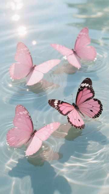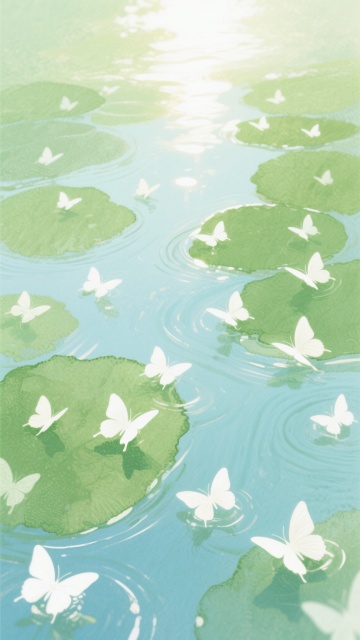 夏日氛围的水面背景,整体色调调整为清新明亮的蓝绿色系,水面上漂浮着翠绿的荷叶和白色的荷花花苞,水面纹理呈现出细腻的波纹和柔和的光斑效果,许多半透明的白色蝴蝶在水面上方轻盈飞舞,画面整体营造出轻盈、梦幻、通透的感觉,光线明亮柔和,带有自然的光晕效果,色彩和谐统一,充满夏日的生机与清凉感。