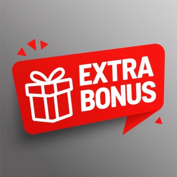 一个平面设计风格的促销标签,以纯净的白色为背景,左侧有一个红色的礼物盒图案,礼物盒带有白色的丝带蝴蝶结和白色的盒盖装饰,右侧是一个红色的不规则多边形横幅,横幅内部用白色大写无衬线字体写着“EXTRA BONUS”,文字与礼物盒图案紧密相连,整体构图简洁明快,在标签的左下角和礼物盒的右上方各有三个红色的小三角形装饰,增强了活泼感和促销氛围,整体视觉层级清晰,信息传达直接高效,符合促销活动吸引眼球的设计目的。
