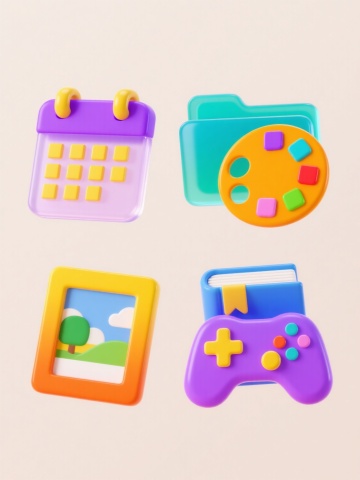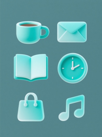 软3D风格系列素材集合,纯色背景,6个完全不同元素内容规整排布,保持元素类目。第一个元素为绿色背景上的立体购物袋图标,圆润造型,高光柔和,阴影细腻;第二个元素为蓝色背景上的立体咖啡杯图标,杯身光滑,带有弧形把手,底部有轻微投影;第三个元素为黄色背景上的立体书本图标,书页有层次感,书脊清晰,整体呈倾斜放置;第四个元素为红色背景上的立体相机图标,镜头突出,机身有圆润边角,细节丰富;第五个元素为紫色背景上的立体音乐符图标,音符线条流畅,具有立体感,悬浮于背景之上;第六个元素为橙色背景上的立体信封图标,信封开口处有折叠细节,整体造型简约大方。所有元素均采用统一的软3D风格,色彩鲜明,排布规整,视觉效果协调统一。