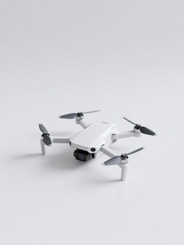 简约现代风格的无人机产品展示图,单架无人机居中规整排布,纯色背景,无任何文字、logo和水印。无人机采用金属灰为主色调,机身线条流畅,细节精致,配备四个螺旋桨和前置摄像头,底部有绿色指示灯。整体画面干净利落,光影柔和,突出无人机的科技感和现代设计美学。