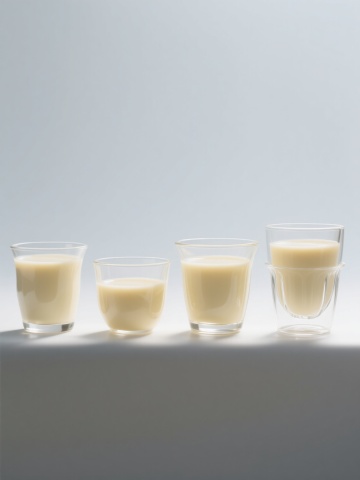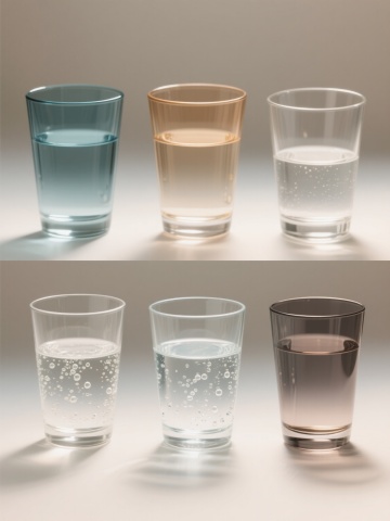 3D渲染风格,极简主义设计,六个不同配色、不同样式、不同材质的水杯造型,上下两行整齐对齐排列,浅色背景,高清晰度,透明质感,光影效果自然,水杯表面光滑,细节丰富,立体感强,现代简约风格,无文字信息,纯净背景,视觉层次分明,材质纹理清晰可见,光线柔和,阴影细腻,整体画面干净整洁。