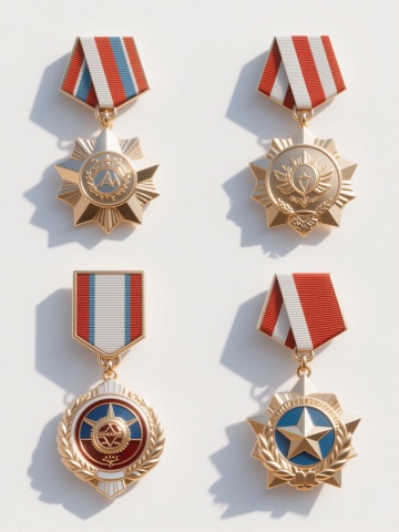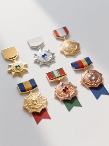 六个不同样式、不同材质的勋章,采用3D立体风格,每个勋章都有光滑的金属质感和明亮的高光效果,带有星形、圆形等不同几何轮廓,搭配金色、银色等金属色调,部分勋章镶嵌有宝石或带有花纹雕刻,勋章顶部有缎带装饰,整体排列整齐,置于纯白色背景上,光影柔和,细节精致,呈现出简洁而高级的视觉效果。