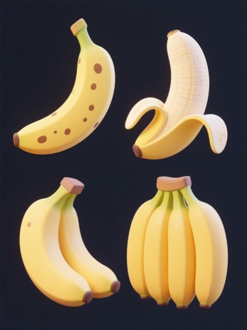 一套四个不同的卡通风格3D食物图标,包括胡萝卜、草莓、香蕉和苹果,每个都有光滑圆润的表面、柔和的渐变色彩、简洁的线条和Q版造型,统一采用纯色背景,整体色彩明快鲜艳,元素类目保持一致,规整地排列成系列素材集合。