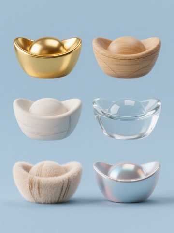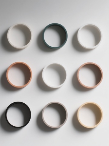 六个不同设计的碗,每个碗都有独特的配色、样式和材质,排列成上下两行对齐的布局,浅色背景,3D渲染,高细节,光滑的陶瓷质感,柔和的光线,阴影细节,简约现代风格,白色基调,高清分辨率,产品展示,无文字。
