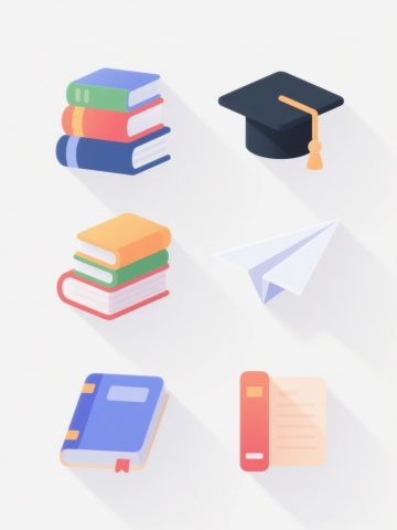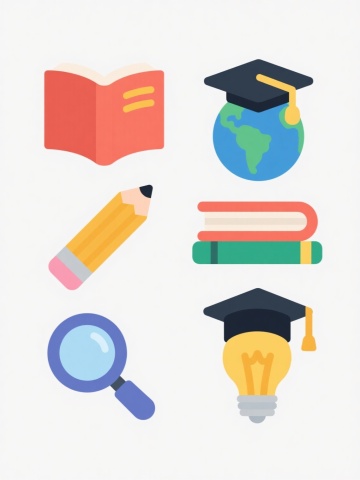 一套由6个完全不同造型的卡通风格学习元素系列素材组成的规整排布集合,每个元素均保持相同的核心内容:一本翻开的橙色封面书本,书页为米黄色,书口有红色细节,书本下方是一本粉色封面的闭合书籍,书脊有两条白色条纹,一支带有橙色笔帽和蓝色笔身的铅笔斜靠在翻开的书页上;所有元素均采用相同的扁平化卡通风格,具有圆润的线条、简洁的造型、均匀的色块填充和轻微的渐变过渡以增强立体感,高光和阴影处理简洁明快,营造出轻松活泼的氛围;每个元素分别置于不同颜色的纯色背景上(如红色、黄色、绿色、蓝色、紫色、灰色),整体画面色彩根据不同背景色进行协调变换,保持元素内容不变,整体排布规整有序,视觉上形成统一且富有变化的系列感。