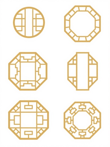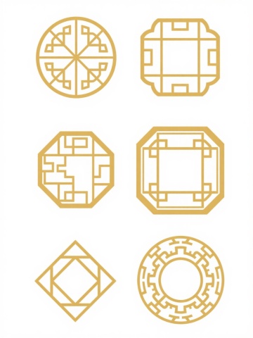 六个同系列矢量花纹图案,每个图案均为圆形或方形轮廓的对称式传统花纹,以单一棕色线条勾勒,白色填充,整体风格简约复古,排列成两行三列的规整布局,所有花纹造型、角度和细节装饰完全不同,均为独立原创设计,背景为纯白色,无任何文字、二维码或其他元素干扰,保持统一的配色方案和装饰性设计感。