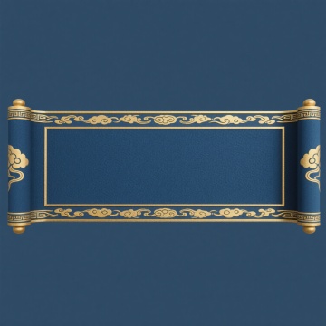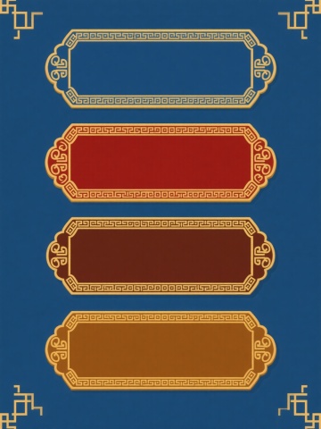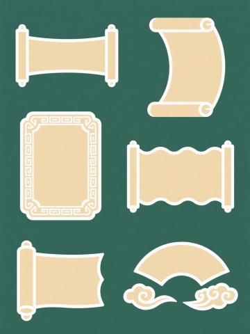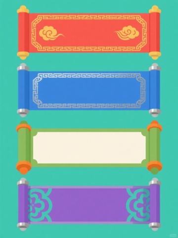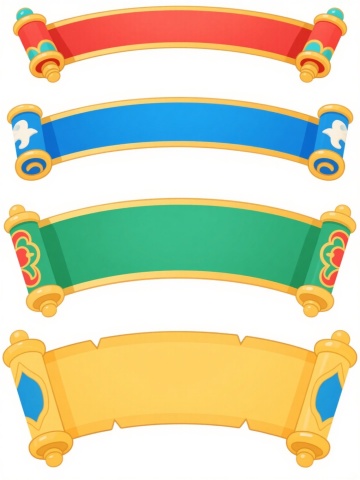 四个中国传统卷轴横幅元素规整排列组成的系列素材集合,每个卷轴保持相同的弧形造型、金色滚边、圆柱形轴头和蓝色装饰环设计,背景为纯色且互不相同,第一个卷轴主体红色配米黄色内芯,第二个卷轴主体靛蓝色配浅灰色内芯,第三个卷轴主体明黄色配浅棕色内芯,第四个卷轴主体翠绿色配淡青色内芯,所有卷轴均采用相同的卡通风格、平滑边缘、简洁线条和平面化色彩处理,整体呈现出统一又富有变化的视觉效果。