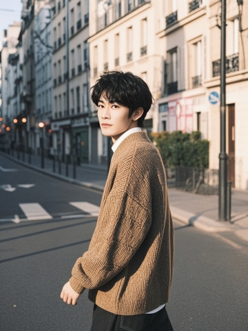 一个男青年(参考图),半身图,巴黎的街道上,黑色短发,穿着图上这件毛衣,比例是1350*455PX,超高清人像摄影,艺术肖像照,氛围感天花板