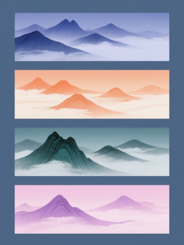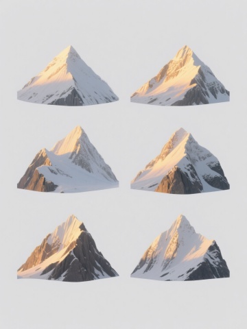 纯色背景下,四个完全不同风格、不同造型的山脉系列素材集合规整排布。第一个山脉采用极简几何风格,棱角分明的三角形山体,以深蓝色为主色调,搭配浅灰色阴影,呈现出冷静现代的视觉效果;第二个为水彩手绘风格,柔和的线条勾勒出山峦轮廓,淡紫色与粉色的渐变色彩晕染其间,营造出梦幻浪漫的氛围;第三个是赛博朋克风格,山体表面覆盖着霓虹灯光效果,以紫色和青色为主,点缀明亮的黄色线条,展现出未来科技感;第四个为复古插画风格,圆润的山体造型,暖棕色与橙色的配色,带有细腻的纹理细节,充满怀旧气息。所有山脉均保持原有的山脉元素内容,仅在风格、造型和整体色彩上进行变换,整体画面信息传达清晰,视觉层级分明,符合系列素材的设计要求。