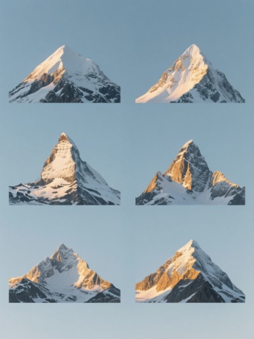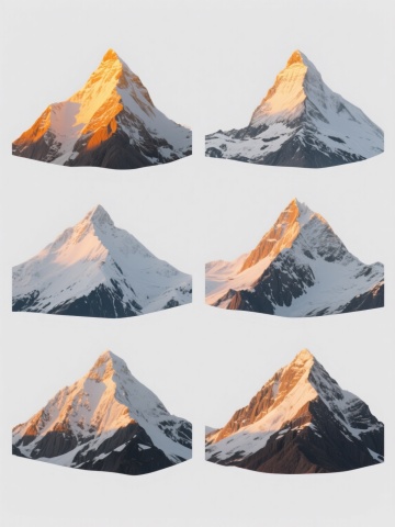 极简主义黑白风格的系列山地插画集合,画面采用纯白色纯色背景,六个完全不同造型的山峰元素规整排布,每个山峰均保持写实的岩石纹理与积雪覆盖的质感,通过不同的山体轮廓、峰峦形态、山脊走向和积雪分布呈现多样性,整体构图平衡对称,黑白对比鲜明,线条简洁有力,具有强烈的现代设计感与视觉统一性,适合作为系列素材使用。