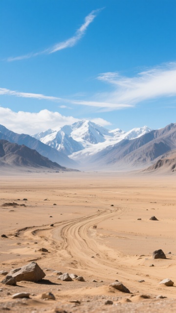 壮丽的雪山全景摄影,雄伟的山峰群在清澈的深蓝色天空下巍峨耸立,山顶覆盖着洁白厚实的积雪,山体岩石呈现出深褐色与灰色的自然纹理,阳光从侧上方照射,在山峰表面形成明亮的高光与深邃的阴影对比,勾勒出尖锐的山脊和陡峭的岩壁轮廓,几朵形态轻盈的白云点缀在山峰之间的蓝天中,近处的山峦呈现出温暖的棕黄色调,整体画面气势恢宏、细节丰富,具有极高的写实感和自然光影层次,营造出宁静而壮阔的高山氛围。