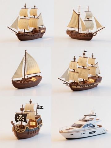 一张展示6个不同造型帆船模型的3D立体风格系列素材集合海报,每个帆船均保持木质船体与书页质感船帆的核心元素,造型分别为:1.经典三桅帆船(主帆高耸,多面副帆),2.复古单桅小帆船(圆形船尾,简洁单帆),3.现代竞速帆船(流线型船体,低平三角帆),4.海盗风格帆船(骷髅旗,多层甲板炮口),5.东方古帆船(四角帆,龙形船首),6.未来概念帆船(透明材质帆面,几何结构桅杆)。帆船们以2x3网格形式规整排布于纯色背景上,保持统一的暖黄色灯光从内部透出的光影效果,木质船体呈现深棕色渐变纹理,书页帆面带有清晰文字印刷质感,整体构图平衡对称,视觉层级清晰,突出每个帆船的独特造型同时保持系列感的统一性。