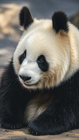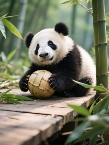 一只可爱的大熊猫幼崽正趴在木质平台上玩耍,它用前爪抱着一个圆滚滚的竹子玩具,头部微微倾斜,眼神天真好奇地望向镜头,蓬松的黑色耳朵竖立着,黑白相间的毛发在阳光下呈现出细腻的质感,周围环绕着翠绿的竹叶和粗壮的竹竿,背景是模糊的绿色竹林,整体画面采用超写实的摄影风格,光线柔和自然,营造出温馨治愈的氛围,具有高度的细节清晰度和真实的动物毛发纹理表现。