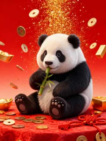 3D风格熊猫萌趣啃竹,鎏金粒子洒落,金币金条环绕,红底喜庆,重拟物质感,卡通可爱,春节氛围浓厚。