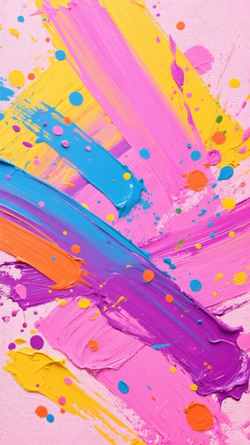 抽象表现主义风格的炫彩背景,以明亮的粉色、紫色和黄色为主色调,融合蓝色和橙色的点缀,呈现出丰富的色彩和谐度。画面采用大胆奔放的笔触质感,厚重的油画颜料堆叠出明显的肌理效果,长而有力的刮擦笔触与飞溅的大小不一的色块、色点相互交织,营造出充满动感和活力的氛围。整体构图饱满,没有明显的视觉焦点,色彩和笔触在画布上自由流淌,形成一种随性而富有生命力的视觉效果。光线表现为均匀的漫反射,使得所有色彩都能充分展现其饱和度和明度,没有强烈的明暗对比,但通过色彩的自然过渡和叠加形成微妙的层次感。炫彩纹路以不规则的曲线和色块分布为主,色彩之间相互渗透融合,既有大块面的色彩区域,也有细腻的色点和线条穿插其中,整体呈现出一种热情洋溢、自由奔放的艺术感觉,适合作为具有强烈视觉冲击力的背景使用。