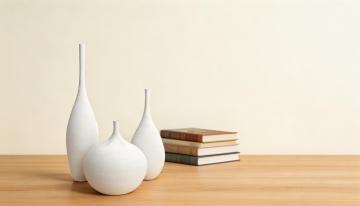 纯色背景上,六个保持原素坯玉壶春瓶造型但整体色彩完全不同的花瓶系列素材集合规整排布,每个花瓶都装饰着大师手笔的丰富有趣花纹,有缠枝莲纹、几何抽象纹、山水写意纹、花鸟工笔纹、敦煌藻井纹和现代波普纹,瓶身色彩分别为霁蓝、胭脂红、明黄、豆青、茄紫和月白,釉面光洁细腻,纹饰清晰生动,整体呈现出典雅又富有创意的艺术美感。