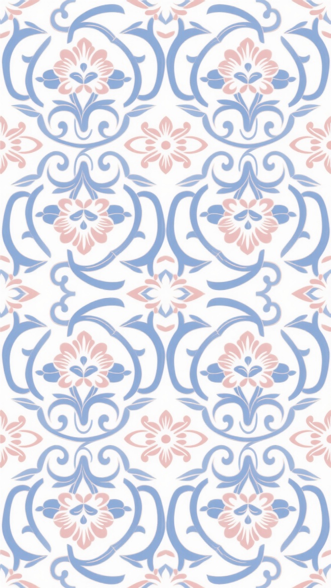 精致的东方传统纹样无缝背景,以流畅的线条勾勒出变形的花卉、卷曲藤蔓与几何图案交织的对称式重复图案,整体造型在保持传统韵味基础上融入现代简约抽象感,色彩变换为靛蓝色与珊瑚粉的柔和渐变线条,在纯白色背景上形成典雅而富有层次感的连续纹样,线条粗细均匀,图案细节丰富且疏密有致,展现出细腻的装饰美学与和谐的视觉韵律。