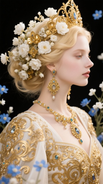 人物穿着冰雪礼服,缀着冰晶颗粒,背景是冰封宫殿, 剔透冷冽滤镜
